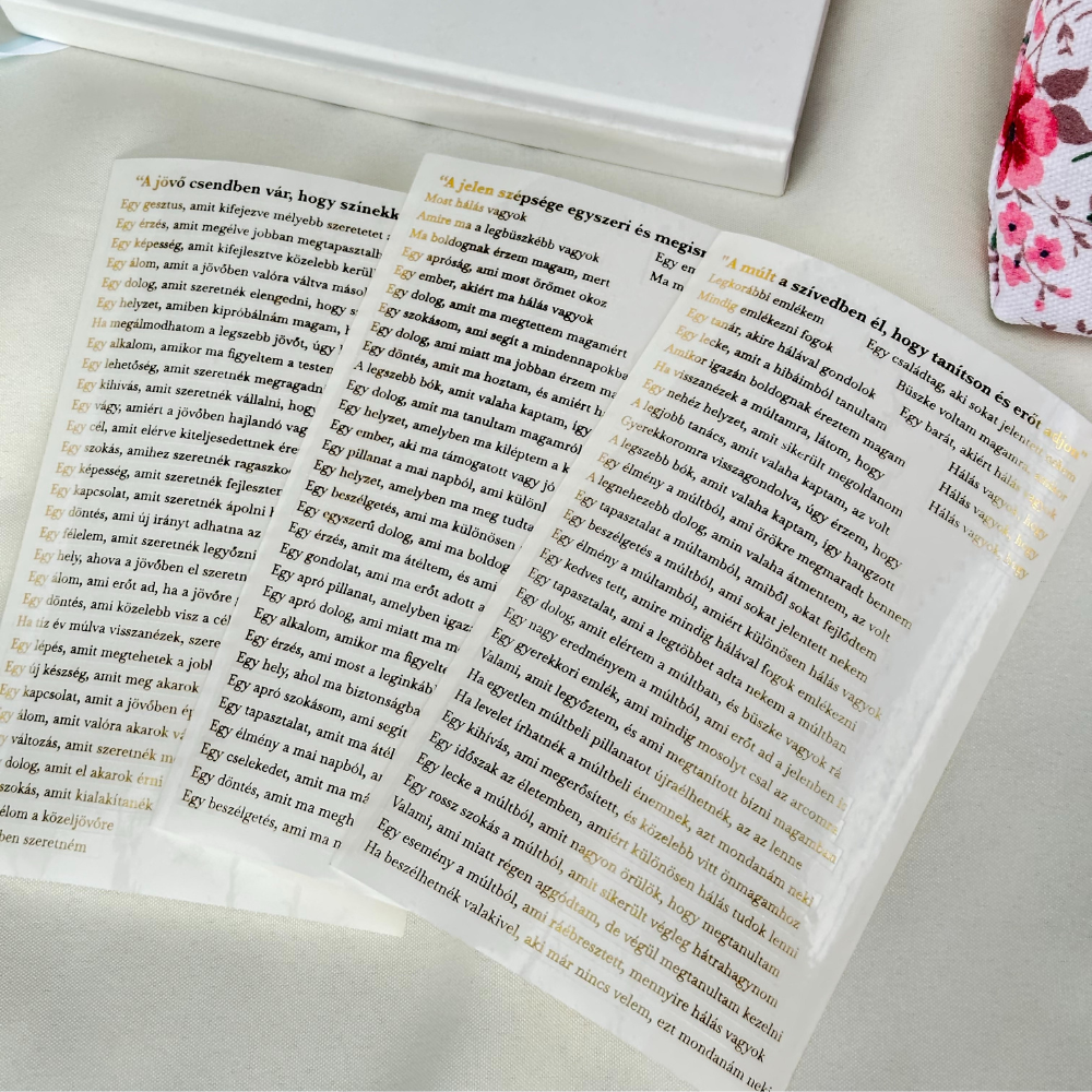 Aranyfóliával nyomjuk rá az általad választott nevet, idézetet vagy rövid üzenetet – nincs előre nyomott minta, csak a Te szavaid.