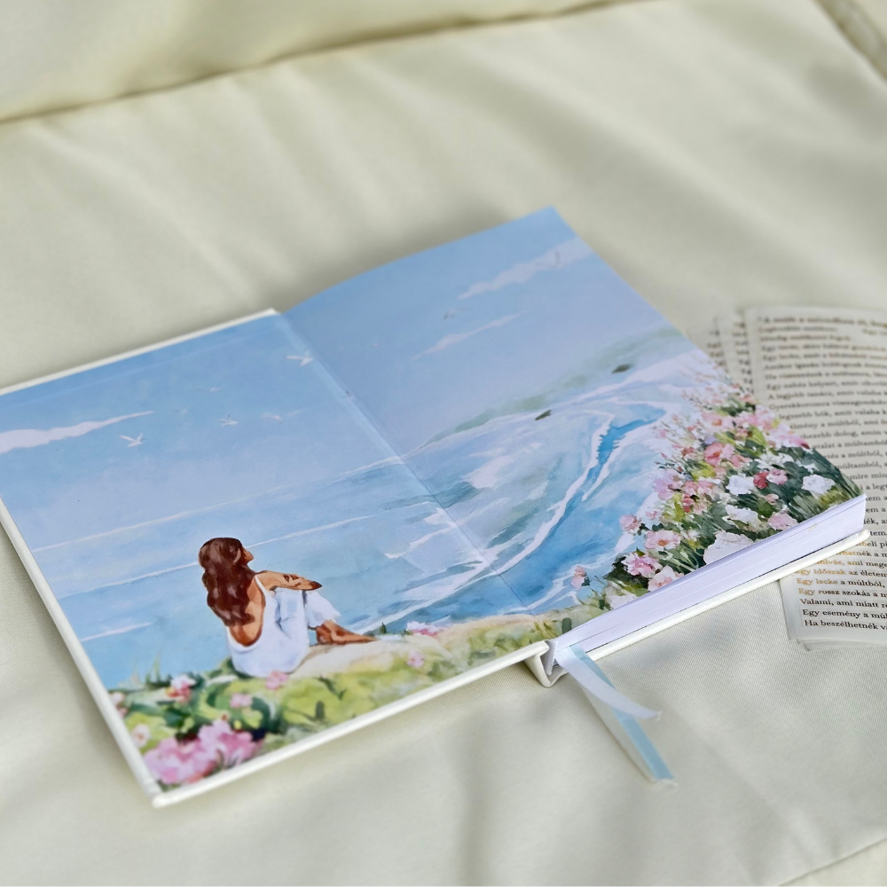 A borító finom tapintású, elefántcsont árnyalatú vászonból készül, és teljesen személyre szabható.